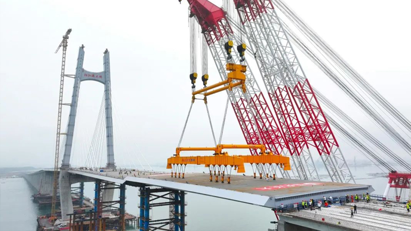 3月30日上午10時02分 隨著最后一塊鋼箱梁成功吊裝到位 陽江港大橋順利合龍 如一條巨龍橫臥海面 標志著廣東省濱海公路 海陵大堤段至溪頭段實現全線貫通 向通車目標邁出了重要一步! 陽江港大橋全長4777.2米 是廣東濱海旅游公路陽江海陵大堤 至溪頭段公路項目的控制性工程 由保利長大工程有限公司承建 巨力索具負責該項目鋼箱梁吊具制作 鋼箱梁采用大節段吊裝方案,分6個節段 最大梁段長90米,最小梁段長74.5米