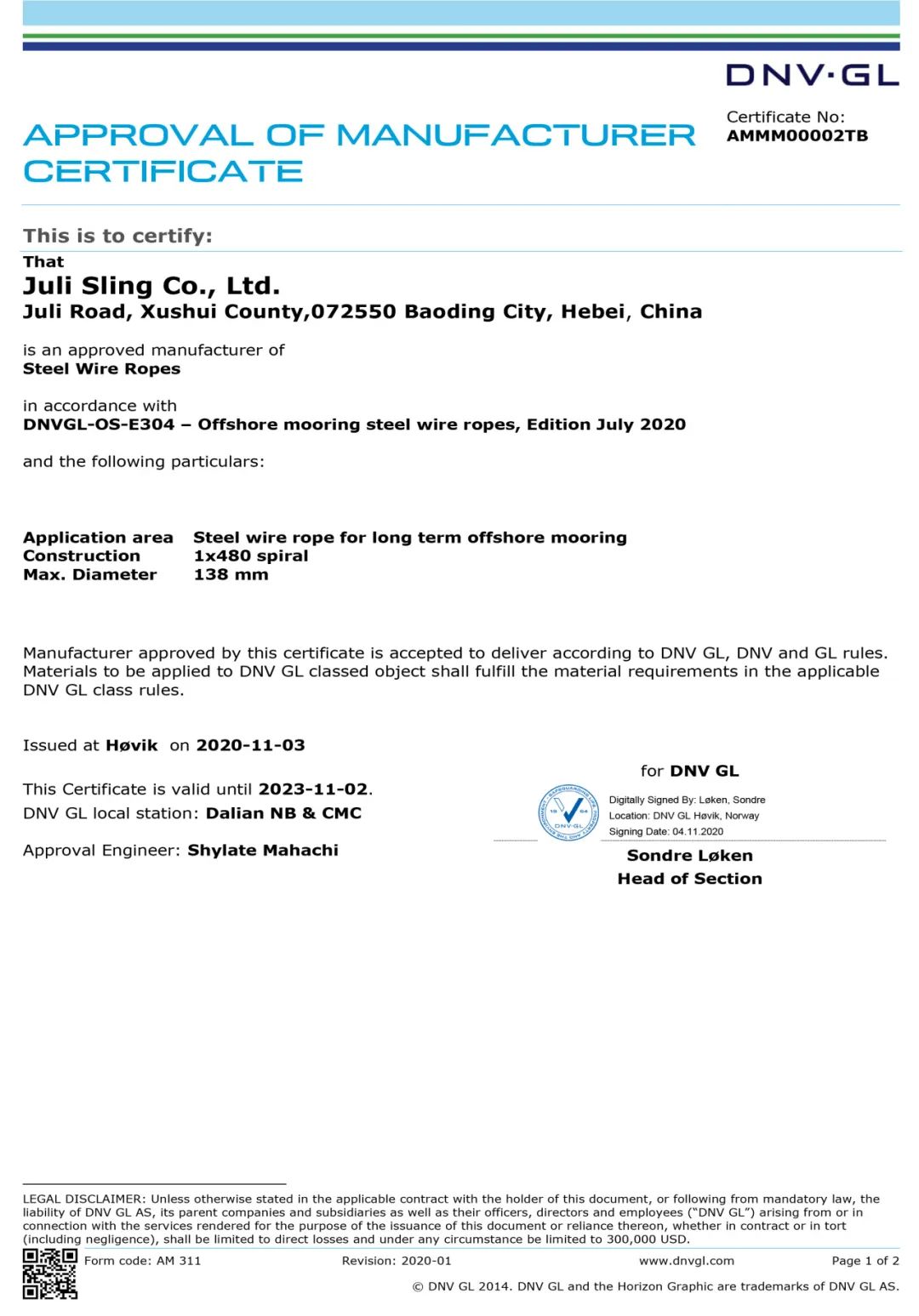 (DNV長(zhǎng)期系泊鋼絲繩接頭及纜繩套環(huán)鍛件工廠認(rèn)可證書)