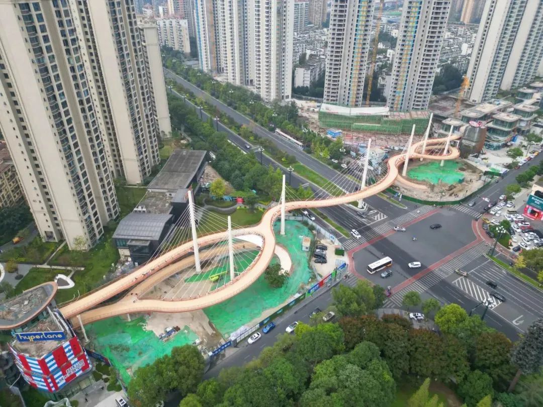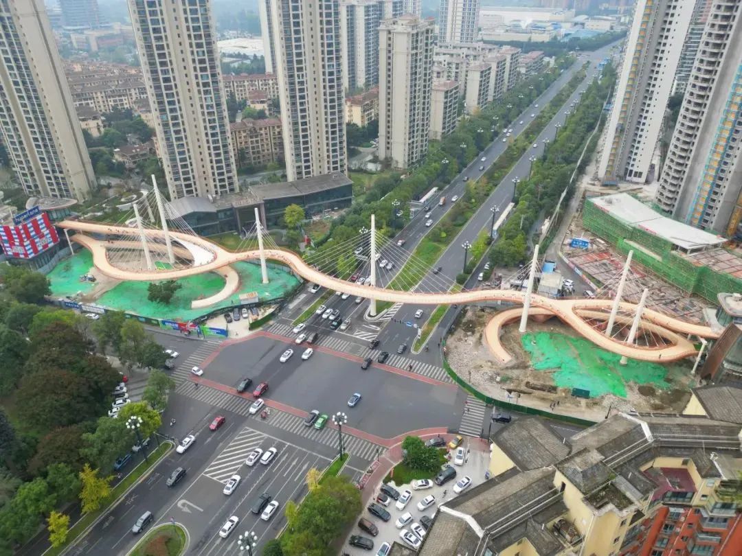 蜀龍路跨線橋主線全長249.6米,共包含7根索塔、100根鋼索以及24節(jié)段鋼箱梁。全橋采用鋼結構實現(xiàn)靈動造型,沒有一座橋墩,通過7根索塔拉起1000余噸橋體。
