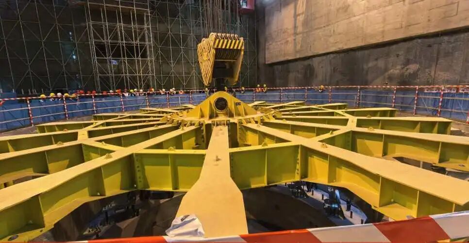 定子作為發(fā)電機組的重要核心部件,主要由機座、鐵芯和繞組三大部件組成。此次吊裝的定子外徑達16.4米,高5.6米,由22萬張0.5毫米厚的硅鋼片疊裝而成,總重量達544.3噸。
