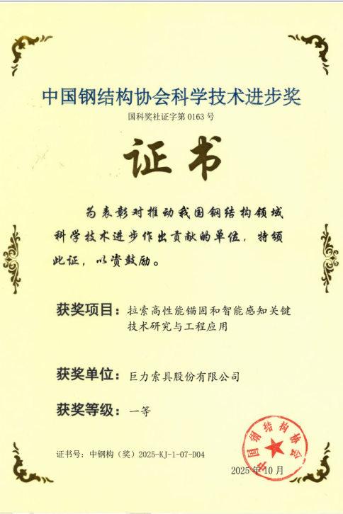 近日,2025年度中國鋼結構協會科學技術進步獎評審結果揭曉。在10月14日于廣西南寧舉行的頒獎典禮上,巨力索具股份有限公司憑借卓越的技術研發實力,一舉斬獲三項一等獎,充分彰顯了公司在高端索具技術領域的創新引領地位。