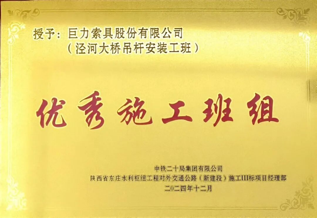 在吊索安裝環(huán)節(jié),巨力索具團(tuán)隊積極優(yōu)化作業(yè)流程,對吊索安裝張拉后的穩(wěn)定進(jìn)行觀測,確保安裝進(jìn)度與質(zhì)量,為大橋的順利通車提供了關(guān)鍵保障。巨力索具團(tuán)隊也因出色的現(xiàn)場表現(xiàn),被項目部授予“優(yōu)秀施工班組”的榮譽稱號。