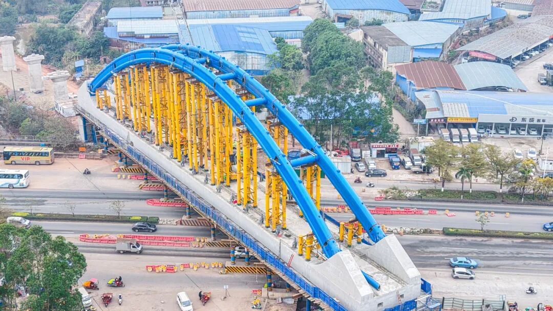該項目位于廣西欽州市欽北區,線路全長4.138公里,其中長達3.293公里的特大橋——跨欽州灣大道鋼管拱橋,是全線的控制性工程。