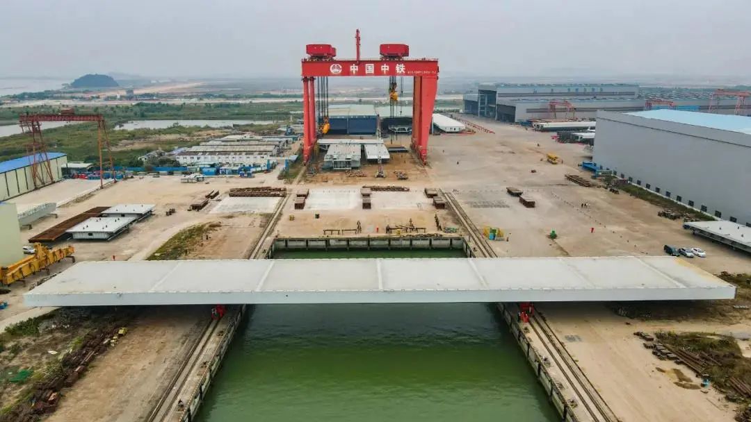 深中通道G05標(biāo)段泄洪區(qū)及淺灘區(qū)鋼箱梁大節(jié)段XG9L的出海平臺(tái)方案為世界首創(chuàng)的出海運(yùn)輸方案,整個(gè)運(yùn)輸過程使用8臺(tái)模塊車,4臺(tái)移梁平車,頂升運(yùn)載能力可達(dá)2000噸。經(jīng)過三次頂升及運(yùn)輸,將鋼箱梁大節(jié)段XG9L從存梁區(qū)運(yùn)至待裝船區(qū),由世界第二起重能力的“天一號(hào)”運(yùn)架一體船將鋼箱梁吊運(yùn)至橋址。