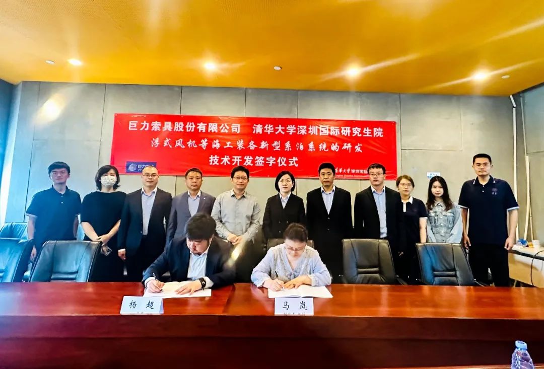 2023年4月13日,巨力索具與清華大學深圳國際研究生院就浮式風機等海上漂浮式構筑物新型系泊系統的研發達成技術開發合作關系并舉行簽約儀式。