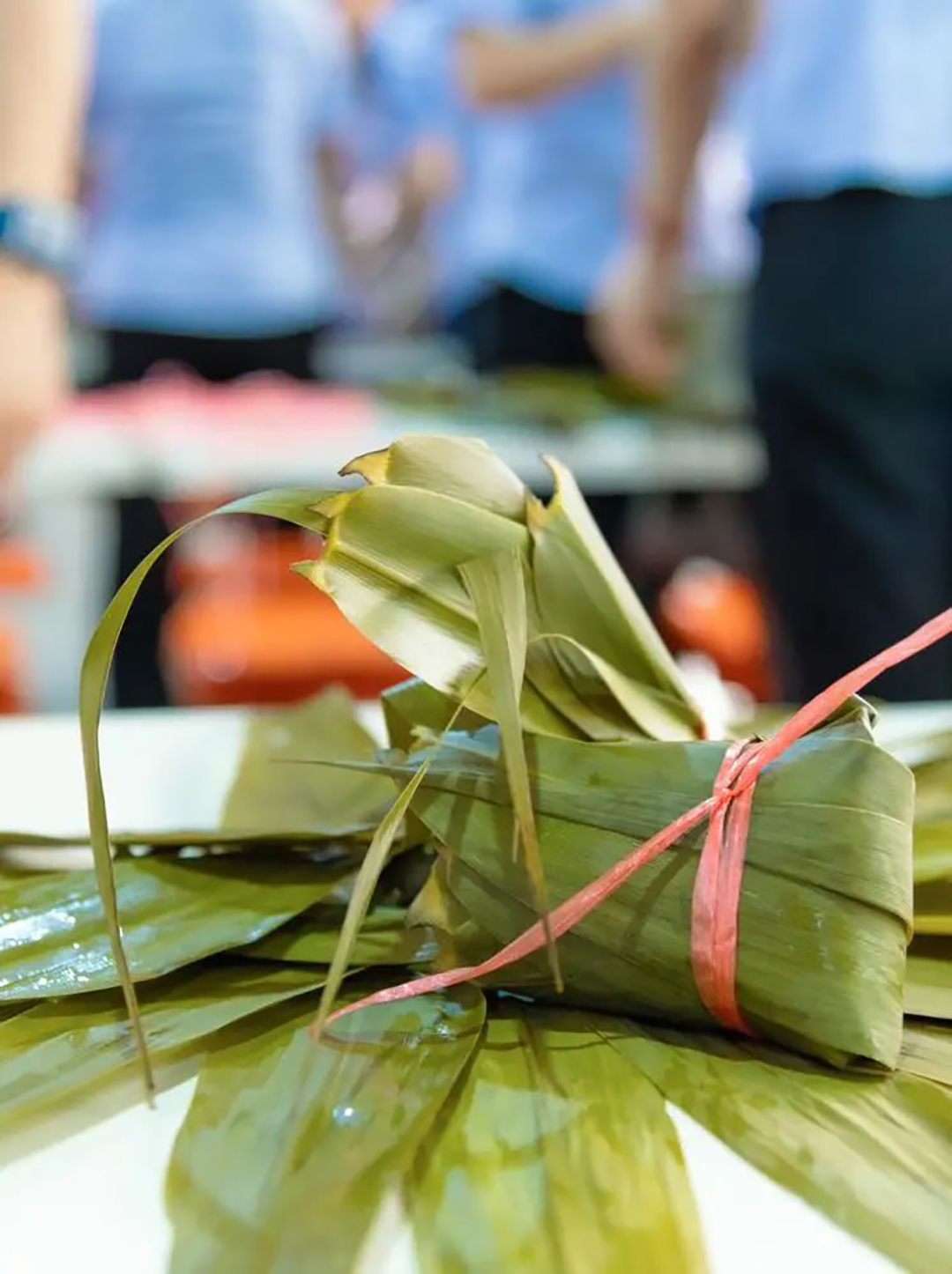 職工們其樂融融地親自動手包粽子,